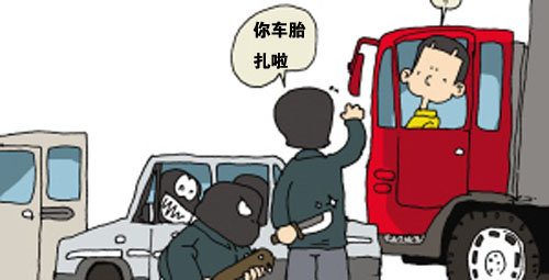 出门在外首要要注意的就是防盗,当然防盗也分很多方面,停车时锁好门窗,不将“引人注意”的物品放在车里。另外,当我们停下来休息的时候,尽量把车停放在有人看守或指定地区,不靠谱的地方不要停。行车途中,如遇有人招手拦车,不要轻易停车,尤其是看起来就来者不善的人。往往这些人就是利用事主好奇、热心这些途径开始犯罪的。比如下图: